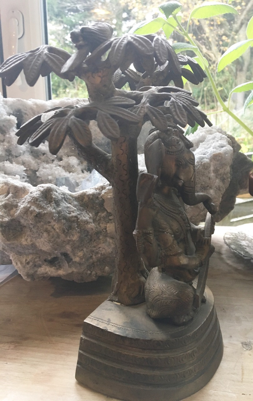 This brass statue measures 10” in height by 8” at his widest point. Sitting under a tree in this way symbolizes enlightenment.