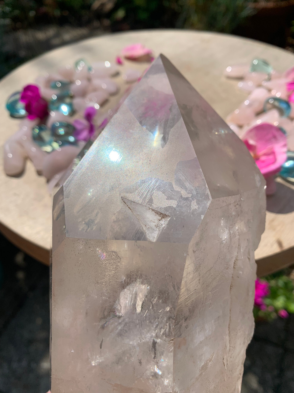 A rare Isis with a left hand time-link measuring 9.5" x 3.25". I was welcomed into this master crystal through it's light-filled consciousness. I was initiated in the mysteries of this crystal and shown it's potential for soul healing. It has an ancient Hathor temple consciousness which desires to assist in deep multi-dimensional healing. A true masterpiece.