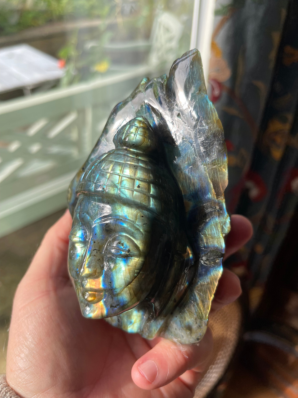 A powerful Labradorite carving of Buddha's face in bedrock. Hand carved and polished, revealing a serene image of Buddha - measures 4.75" x 3.5".