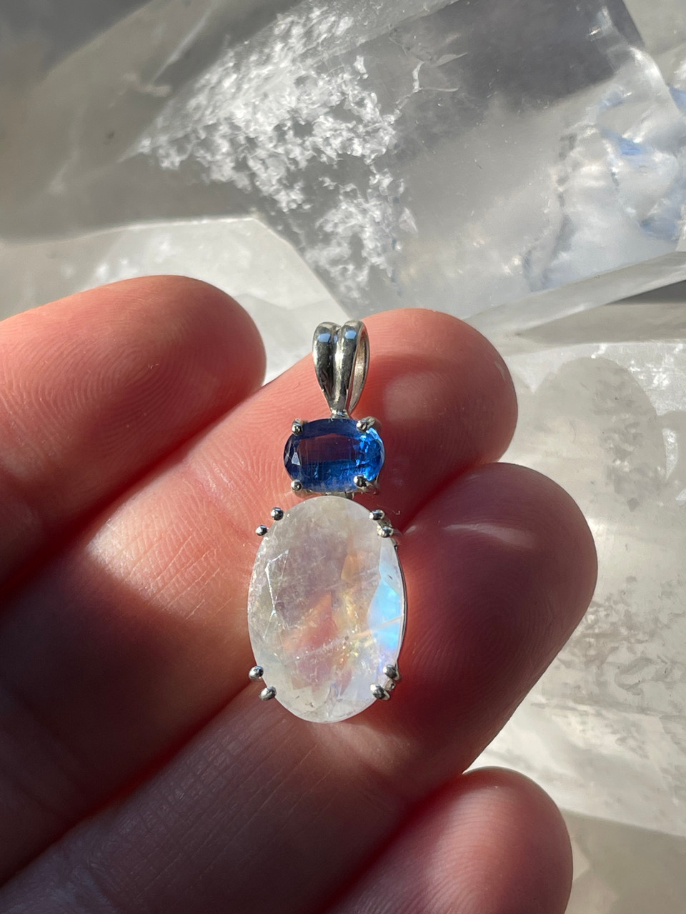 A faceted Moonstone with a Kyanite set in silver - measuring 1.25” x 0.5”