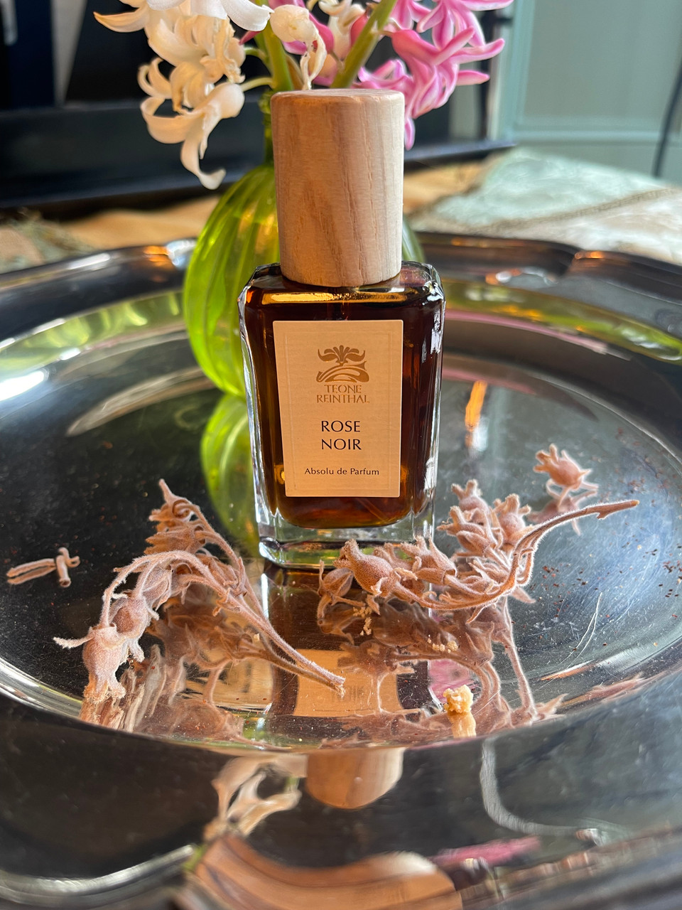 "What began as a sharp-thorned, sulky rose chypre simply insisted that I add more and more and more lush red roses, as well as a very luxurious selection of other rare and precious aromatics. What has finally emerged is a magnificent red rose bloom. Balanced, richly textured and deeply satisfying. A deliriously happy perfumer now rests on a bed of roses". Teone Reinthal.