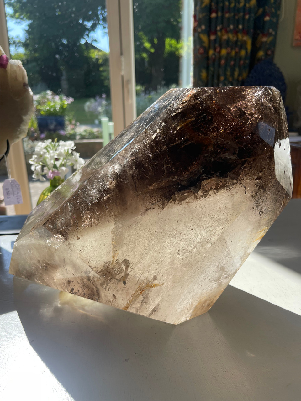 A beautiful specimen piece of natural Smokey Quartz Elestial that measures 15" in length x 7" wide. There is a distinct line between the Smokey and Clear quartz and this line captured my imagination. As I examined the line and the crystal as a whole the word Threshold came through.