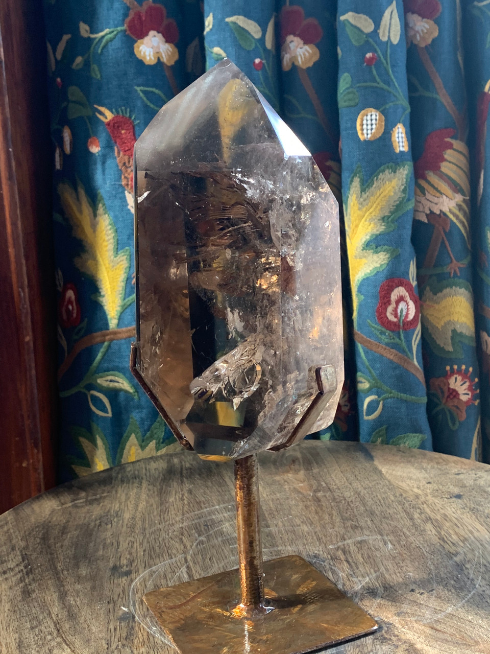 A beautiful phantom Smokey quartz resting in a copper colored metal stand. Being in the stand seems to magnify it's energy.