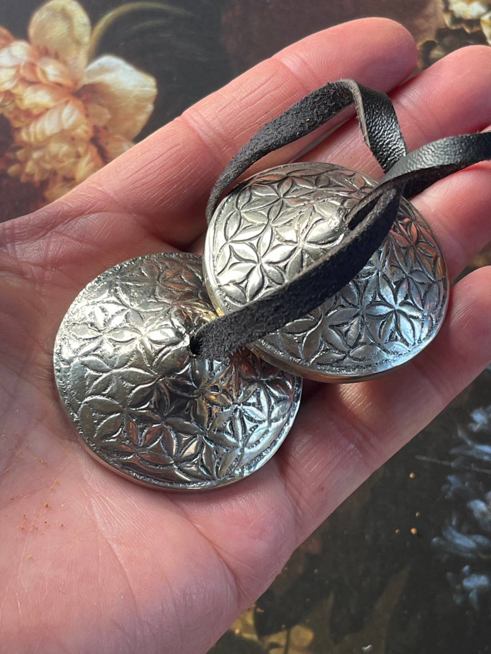 These Flower of Life Tingsha measure 2", and they are handmade in Nepal by Tibetan artisans.